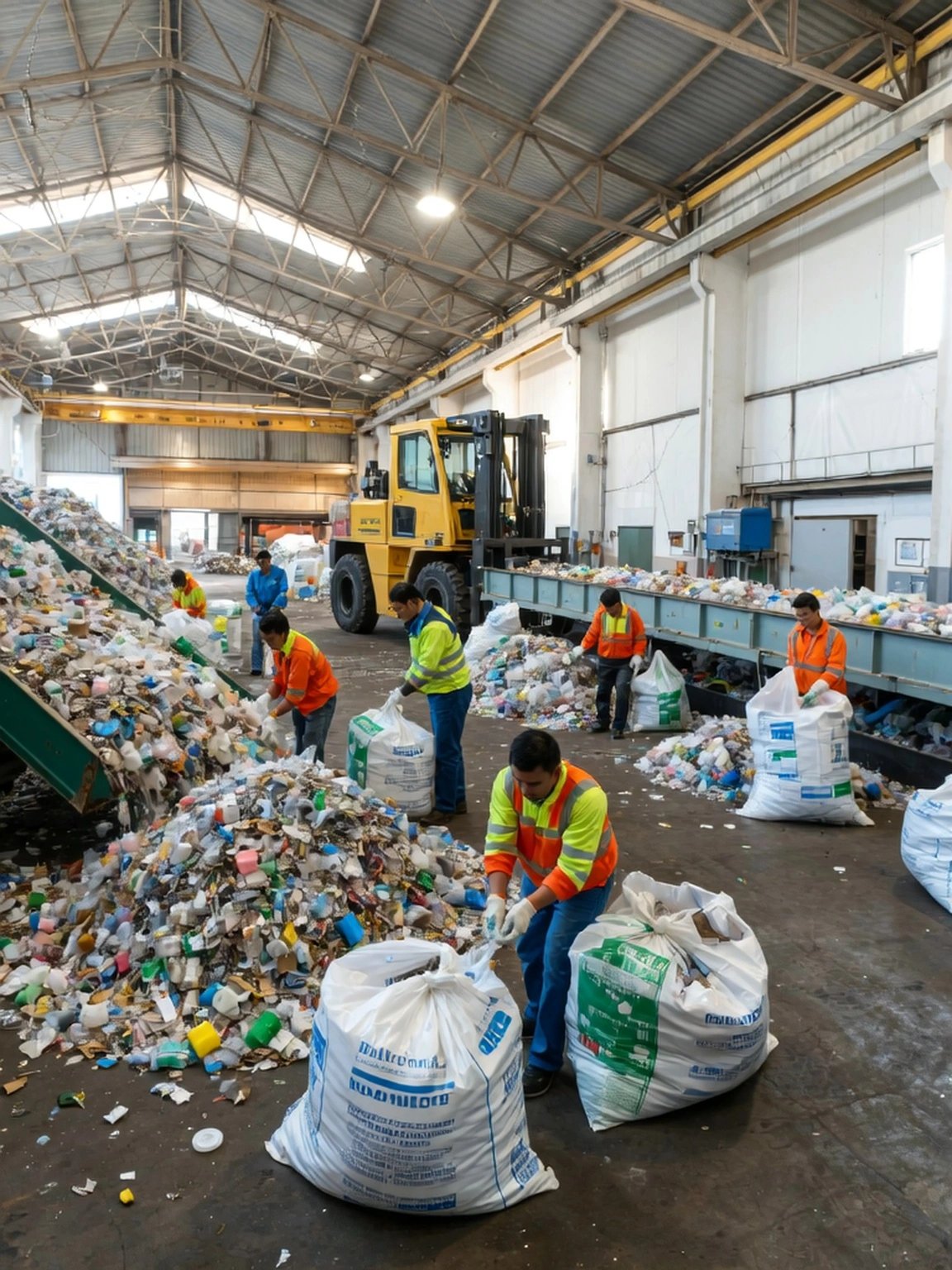 Karung jumbo untuk penyimpanan hasil daur ulang seperti resin dan plastik pellet, tersedia untuk kebutuhan industri.